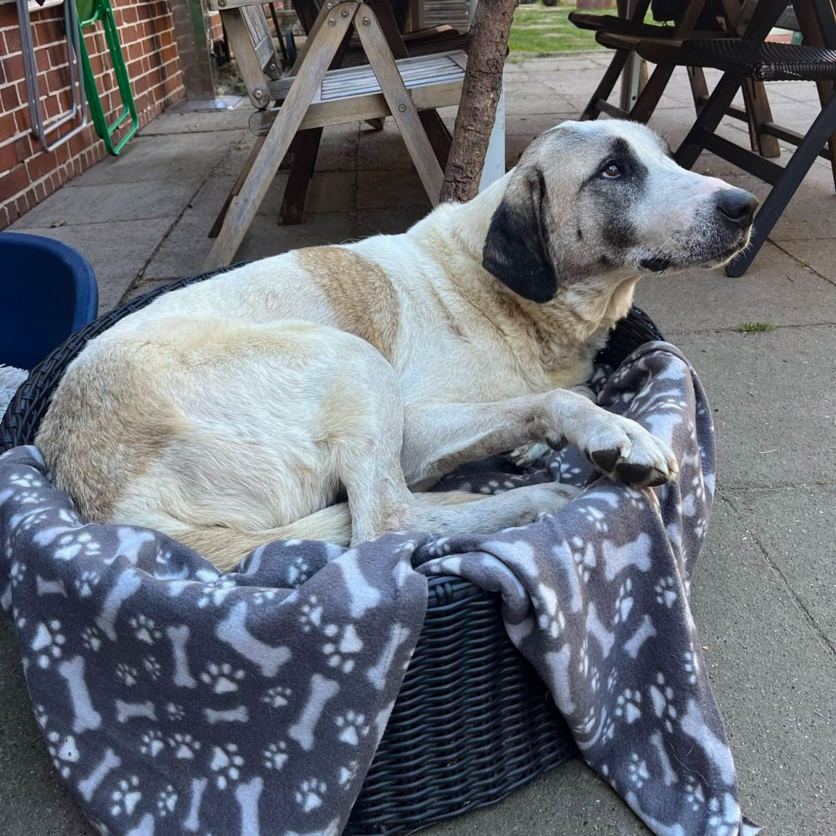 Er ist eher ein Eigenbrötler, liebt es, im Garten zu liegen und zu beobachten. Ein eigenständiger Typ halt. Im Haus ist er gerne für sich und träumt. Nur wenn es draußen kalt ist und seine Pflegeeltern den Kamin anmachen, gesellt er sich gerne zu den anderen Hunden. Er spielt nicht mit Artgenossen und Spielzeug findet er uninteressant. Sein Pflegefrauchen hat er neulich mit einem lauten „Wuff“ unterstützt als zwei andere Hunde im Spiel zu grob wurden. Er mag keinen Streit.
