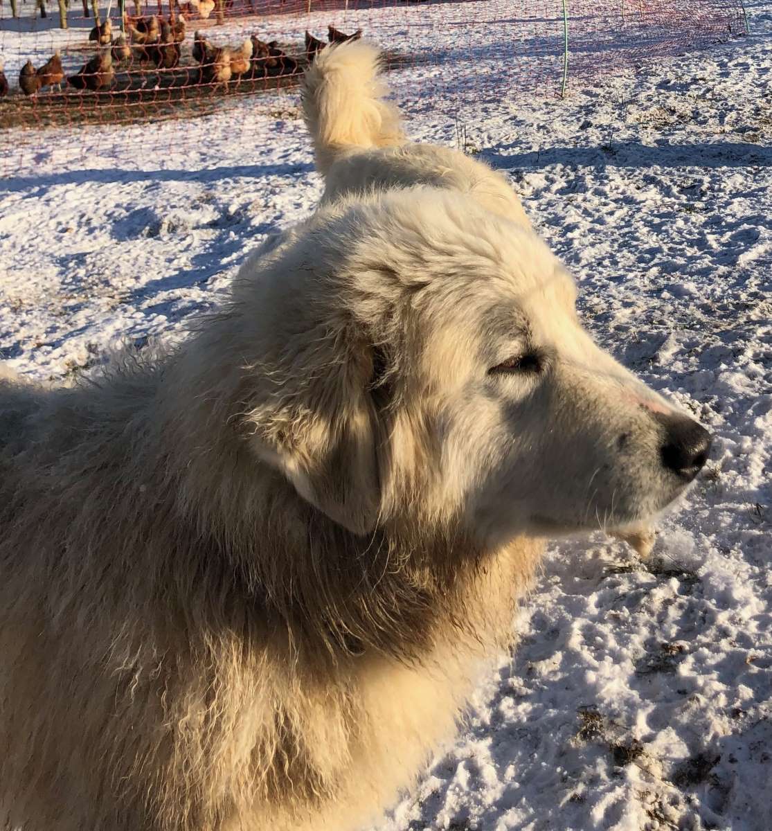 Gleichzeitig bringt er die typischen Eigenschaften eines Herdenschutzhundes mit: Fremde Menschen werden zunächst angebellt, was seiner Aufgabe bei uns entsprechend völlig normal ist. Aktuell lebt er ganzjährig draußen bei unserer Hühnerherde.