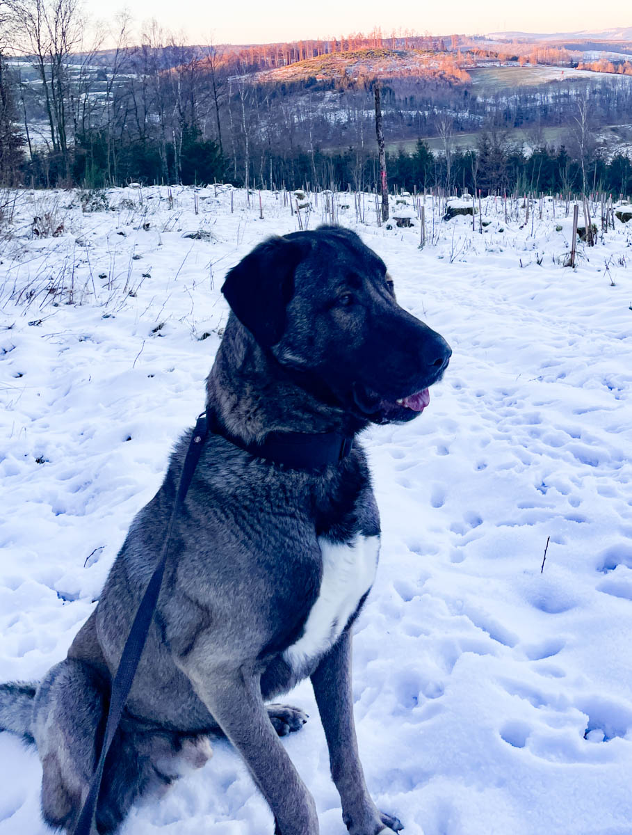 Unser gemeinsamer Weg war nicht einfach. Wir haben verschiedene Hundeschulen besucht, leider ohne nachhaltigen Erfolg. Efe ist sehr schnell in hoher Erregung. Ein Maulkorb ist aktuell Pflicht und wird getragen. Tierarztbesuche oder körperliche Manipulationen sind für ihn mit starkem Stress verbunden. Er lässt in vielen Situationen keine Fremdeinwirkung zu und es gibt Momente, da ändert sich sein Verhalten schlagartig. Prinzipiell kennt er Grundkommandos wie Sitz, Platz, Stopp, Bleiben, aber sobald wir vor die Tür treten, ist der Stress zu hoch und sein Hirn schaltet sich aus.