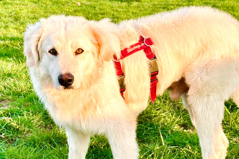 Gigio ist im Vergleich zu seiner Schwester Gigia der schüchterne und vorsichtige. Er fand das Fotografieren sehr aufregend und wollte am liebsten nur auf dem Arm bleiben. Gigio wird sich aber in einer vertrauten Umgebung schnell welpentypisch verhalten und mit Neugier seine Umwelt entdecken wollen. Er ist ein rein weißer Maremmano-Mischling mit wunderschönen dunklen Augen. Er wird voraussichtlich ein großer Hund mit einer Schulterhöhe von um die 60 cm werden.
