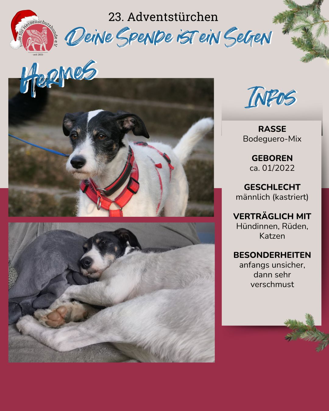Vielleicht fragst du dich, warum Hermes als Bodegueromix seinen Platz bei unserem Verein gefunden hat, obwohl wir uns eigentlich auf Herdenschutzhunde spezialisiert haben. Die Antwort ist ganz einfach: Eine unserer engagierten Betreuerinnen kümmert sich auch um Pflegehunde kleinerer Rassen. Als sich für Hermes nach der Auflösung seines bisherigen Vereins keine sichere Perspektive mehr bot, stand er plötzlich ohne Zukunft da. Für uns war sofort klar: Wir lassen ihn nicht im Stich. So haben wir Hermes aufgenommen – und er dankt es jeden Tag mit seiner Lebensfreude und Liebe.