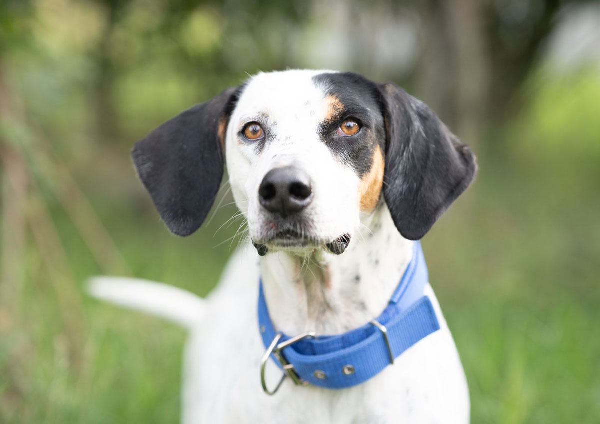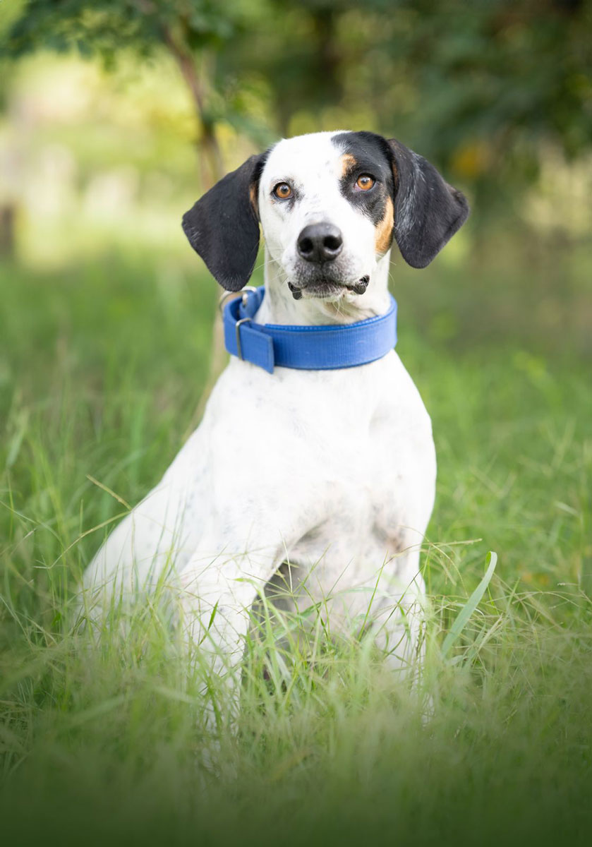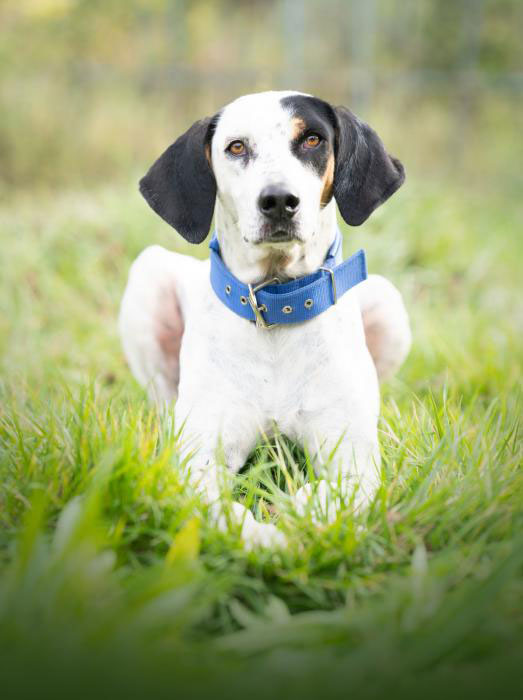 Sie wurde von einem Jäger verlassen, der sie unter sehr schlechten Bedingungen in einem Zwinger gehalten hatte. Mittlerweile ist sie sich von einer Operation an einer Beinverletzung vollständig erholt.