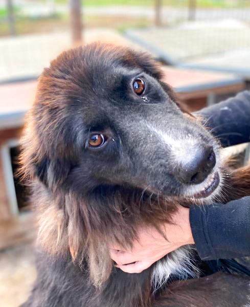 Pollie ist eine schwarze Schönheit, die so klein in der Hütte wirkte, als sie so über den Hüttenrand lunzte. Als sie dann aus der Hütte kam, entdeckten wir ihre ganze Schönheit, doch ihr Fell ist leider sehr verfilzt. Sie freute sich über unsere Leckerlis und wirkte freundlich und aufgeschlossen. Da sie die meiste Zeit in der Hütte lag, konnten wir nicht so viel Interaktion erleben, was sicherlich auch der Wärme geschuldet war.