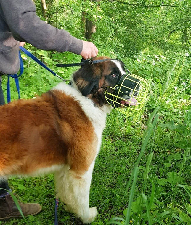 An der Leine spazieren gehen klappt immer besser. Er hat gelernt Sitz zu machen und sich etwas beleidigt den Maulkorb aufsetzen zu lassen.