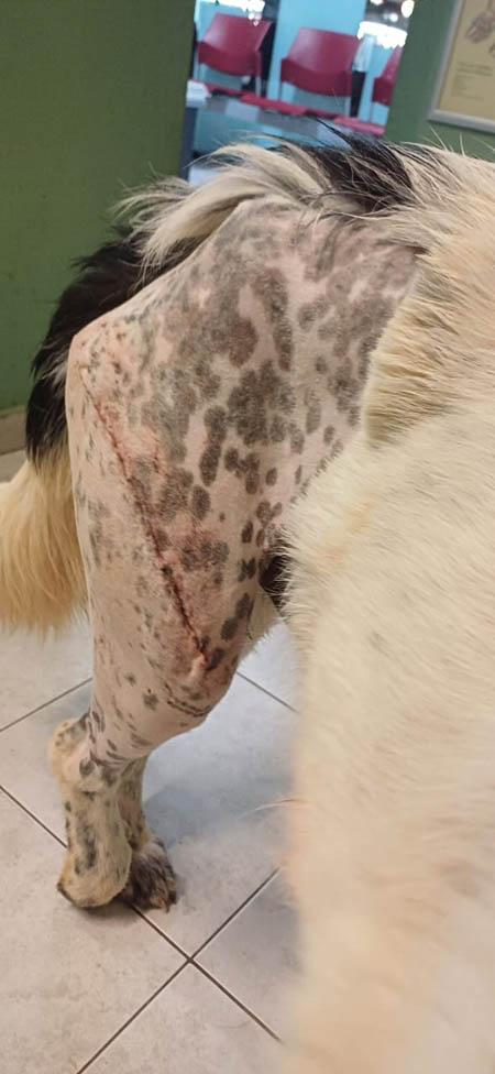 Dieser hübsche Junge, dessen Name nun Theo ist, wurde am 6. Oktober 2025 an einer Landstraße, etwa 1 Km vom Shelter entfernt, gefunden. Offenbar wurde er von einem Auto angefahren. Sein Bein war gebrochen und er benötigte dringend eine orthopädische Operation, um das Bein wieder herzurichten.