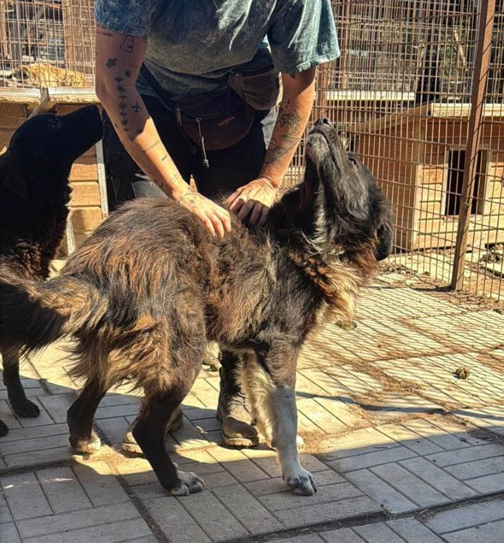 Uns gegenüber zeigte er sich offen und freundlich, legte sich beim Streicheln entspannt hin und präsentierte sein Bäuchlein, ganz offensichtlich genoss er die Zuwendung in vollen Zügen und konnte garnicht genug davon bekommen. Wir haben festgestellt, dass er leichte Probleme mit der Hinterhand hat, die sein Gangbild etwas verändert. Trotz dieser Einschränkung lebt er in einem gemischten Rudel und zeigt sich dort mit den Hündinnen verträglich, während der Umgang mit anderen Rüden etwas schwieriger sein könnte.