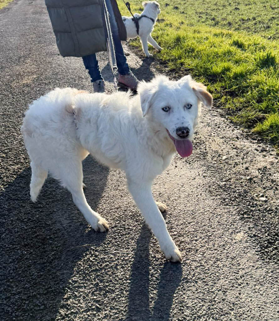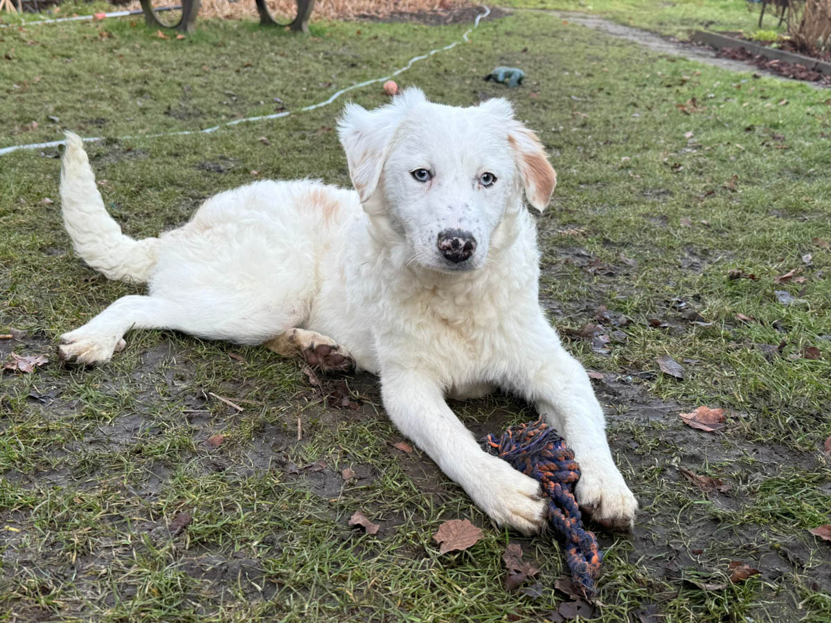 Yuki wächst zu einer beeindruckenden jungen Hündin heran. Ausgewachsen wird sie vermutlich eine Schulterhöhe von etwa 55–60 cm erreichen. Mit ihren zwei strahlend blauen Augen zieht sie sofort alle Blicke auf sich – doch nicht nur ihre Optik macht sie so besonders, sondern vor allem ihr liebevolles Wesen.